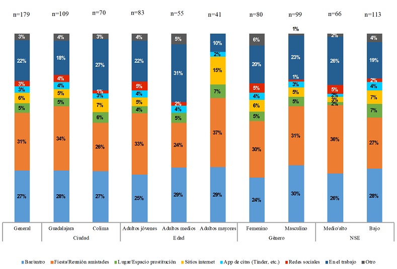 En el caso de ambas ciudades los lugares tradicionales suman un 80%, y los mediados por la tecnología resultan con un 13% en Guadalajara y 11% en Colima. El lugar de trabajo es más importante para los adultos medios, mientras que las fiestas y reuniones lo son más para los mayores y jóvenes, seguramente por estar menos presentes en el mercado laboral. Los hombres acuden más que las mujeres a bares y antros, 30% frente a 24%, y ambos acuden a sitios de prostitución en un 5%. Este dato resulta revelador pues deja atrás la idea en torno de que son únicamente los hombres quienes pagan por sexo. En lo que concierne a la distinción por NSE, el nivel medio/alto acude en busca de aventuras mucho más a fiestas y reuniones que el bajo, 36% frente a 27%, y en el bajo es más frecuente acudir a sitios de prostitución que en el medio/alto, 7% frente a 2%
