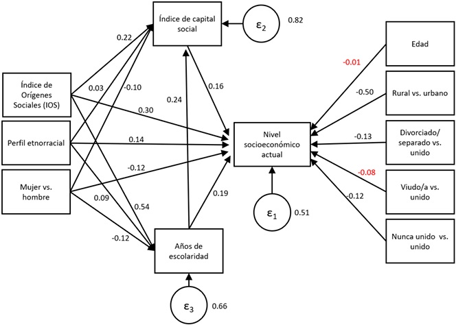 Las últimas dos hipótesis se refieren a la asociación entre el capital social y el nivel socioeconómico. Específicamente, me pregunté si, independientemente de otras variables, el capital social se asocia significativamente al nivel socioeconómico alcanzado por las personas. Además, propongo investigar el papel del capital social como mediador de los efectos del origen socioeconómico, el perfil etnorracial, el sexo y la escolaridad.