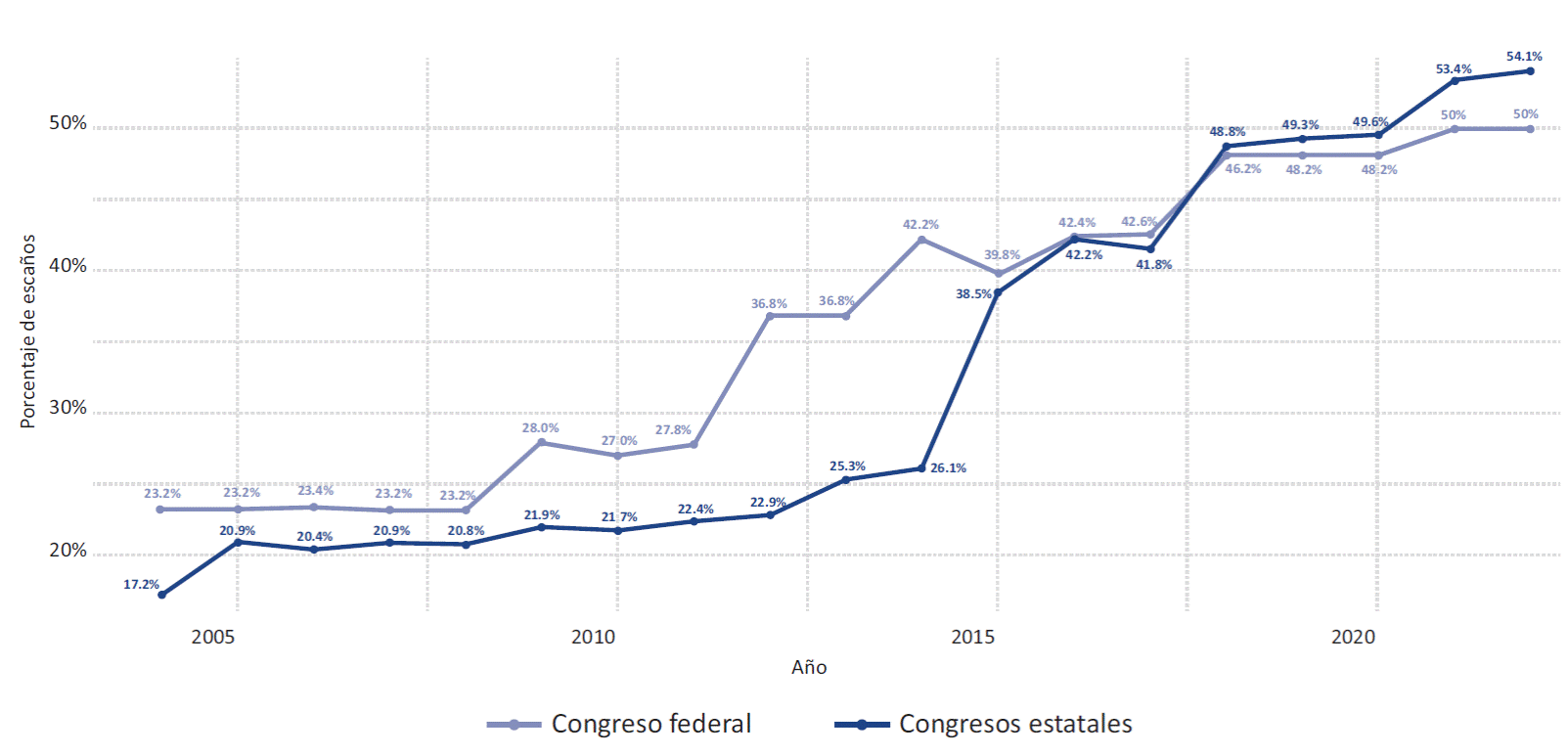 El largo camino hacia las cuotas y, finalmente, la paridad, ha permitido avances sustantivos en la presencia de las mujeres en los Congresos mexicanos (Freidenberg y Garrido de Sierra, 2021). Desde inicios de la década de 1990, México ha perfeccionado su régimen electoral de género mediante reformas legislativas, interpretaciones de autoridades electorales y demandas de organizaciones feministas (Caminotti y Freidenberg, 2016; Freidenberg y Gilas, 2021). El diseño e implementación de las normas han sido esenciales para la inclusión de mujeres en espacios de poder. En casi 20 años, la representación femenina en los Congresos estatales ascendió del 17.21% en 2004 al 54.1% en 2022, y del 23.2% al 50% en el Congreso federal.