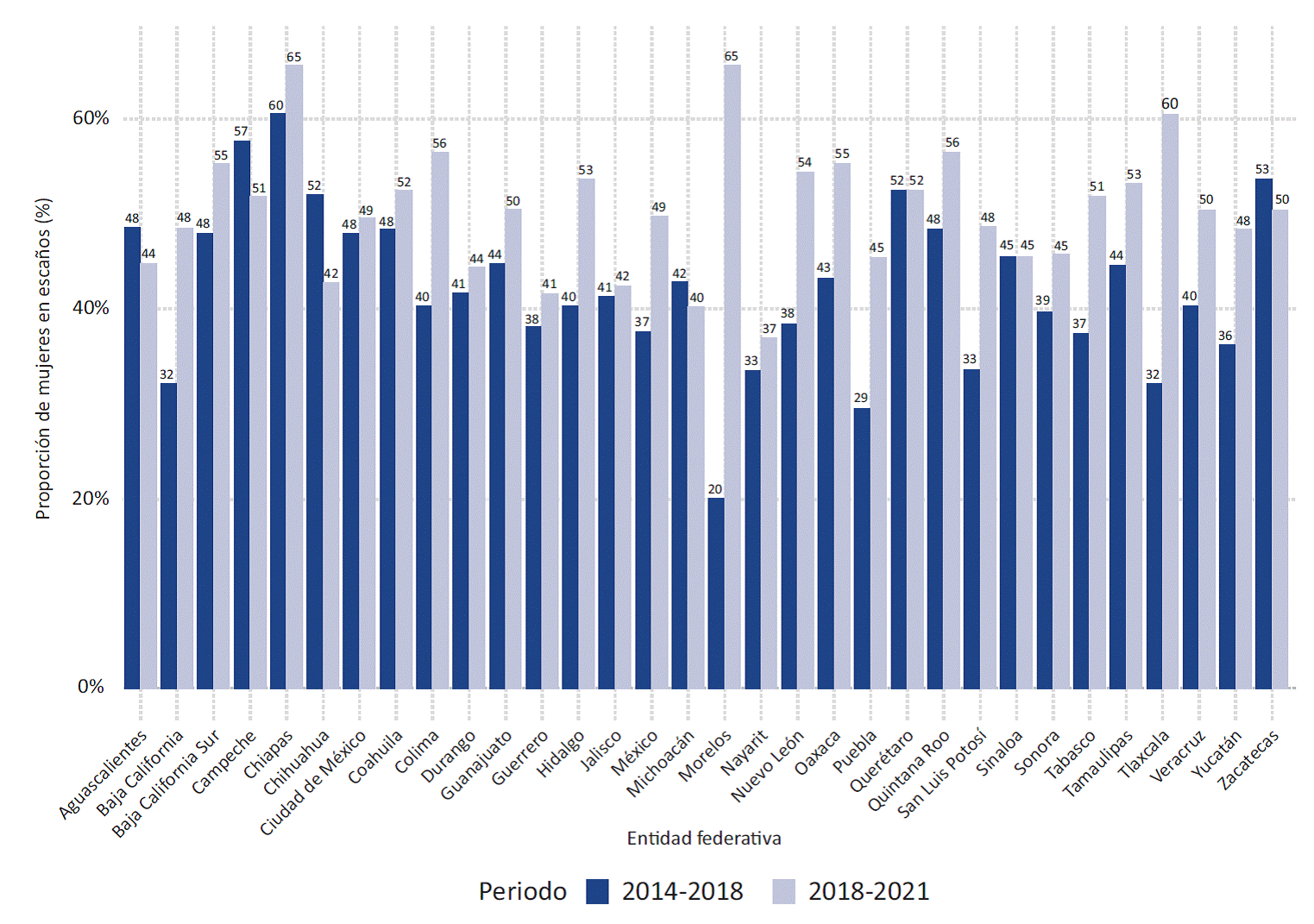 Gráfica 2 Representación descriptiva de las mujeres en los Congresos estatales, 2014-2018 y 2018-2021