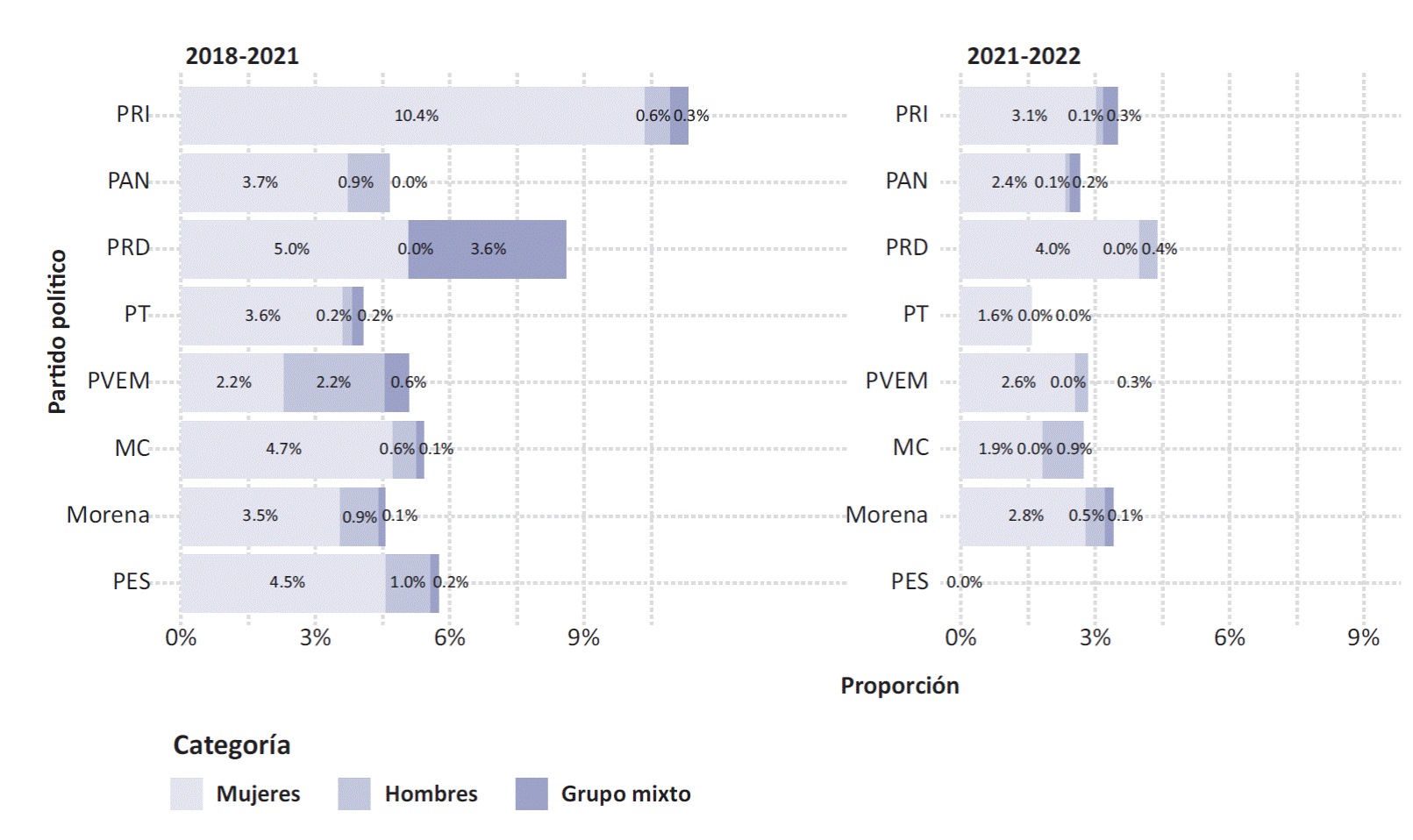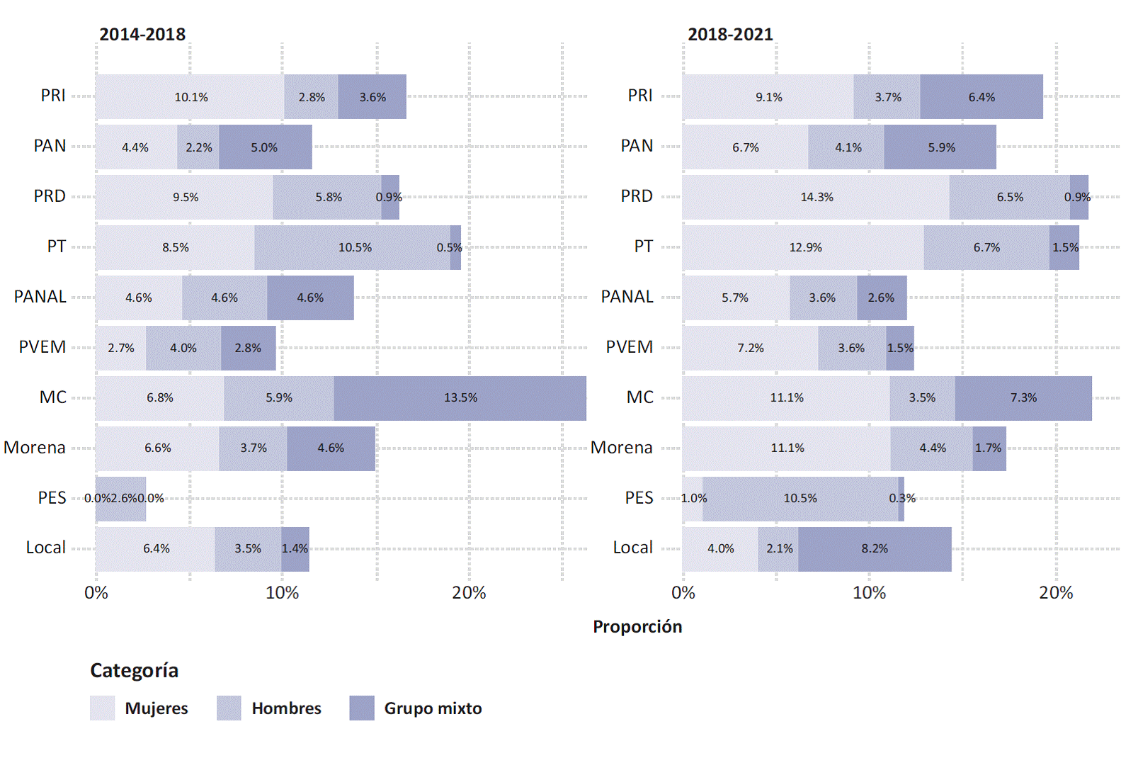 | Cámara de Diputados | 2018-2021 | 48.2% | 5.6% (396) | 18.4% (73) |