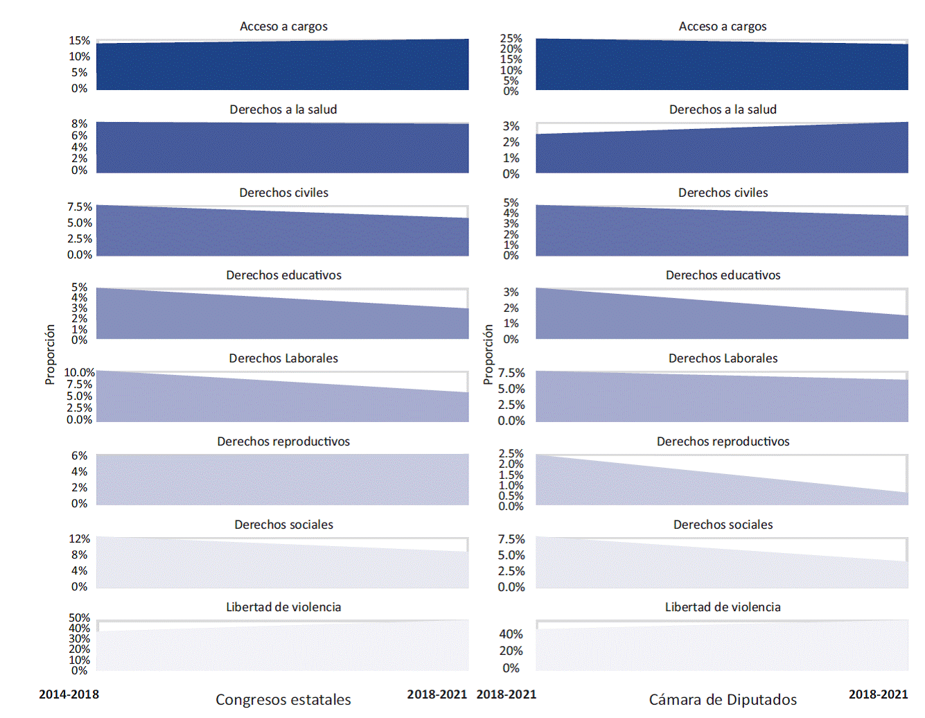 Al comparar los dos niveles legislativos, se observa que algunas agendas, como las de derechos laborales y civiles, se han vuelto menos importantes tanto en los Congresos estatales como en la Cámara de Diputados. El aumento de las iniciativas relativas al acceso a cargos entre las dos legislaturas analizadas en los Congresos estatales y su disminución a nivel federal en el segundo periodo reflejan cómo ciertas agendas, adoptadas a nivel nacional, trascienden después a las legislaturas estatales (como fue, precisamente, con las reformas de la “paridad en todo”).