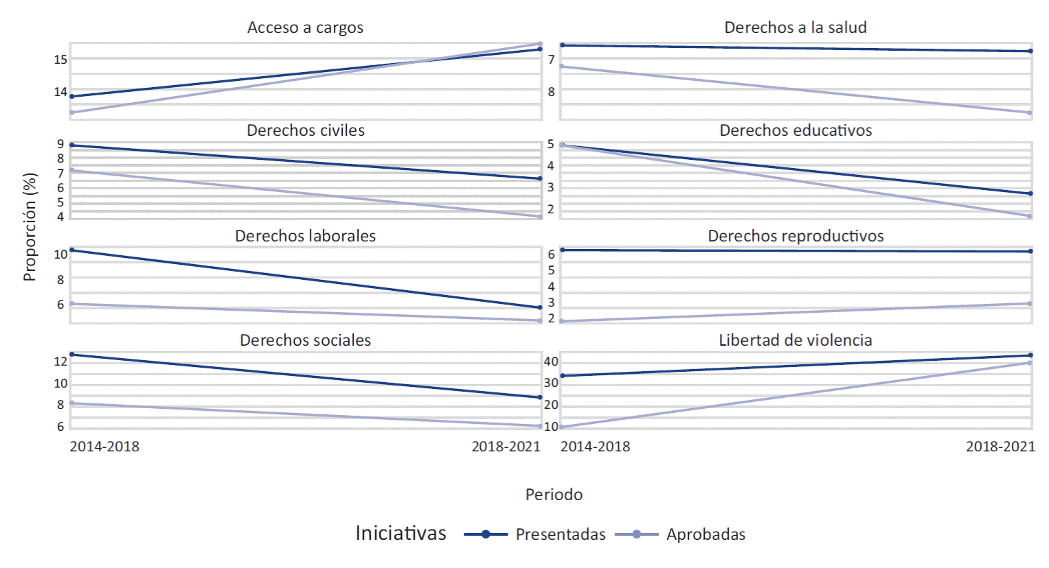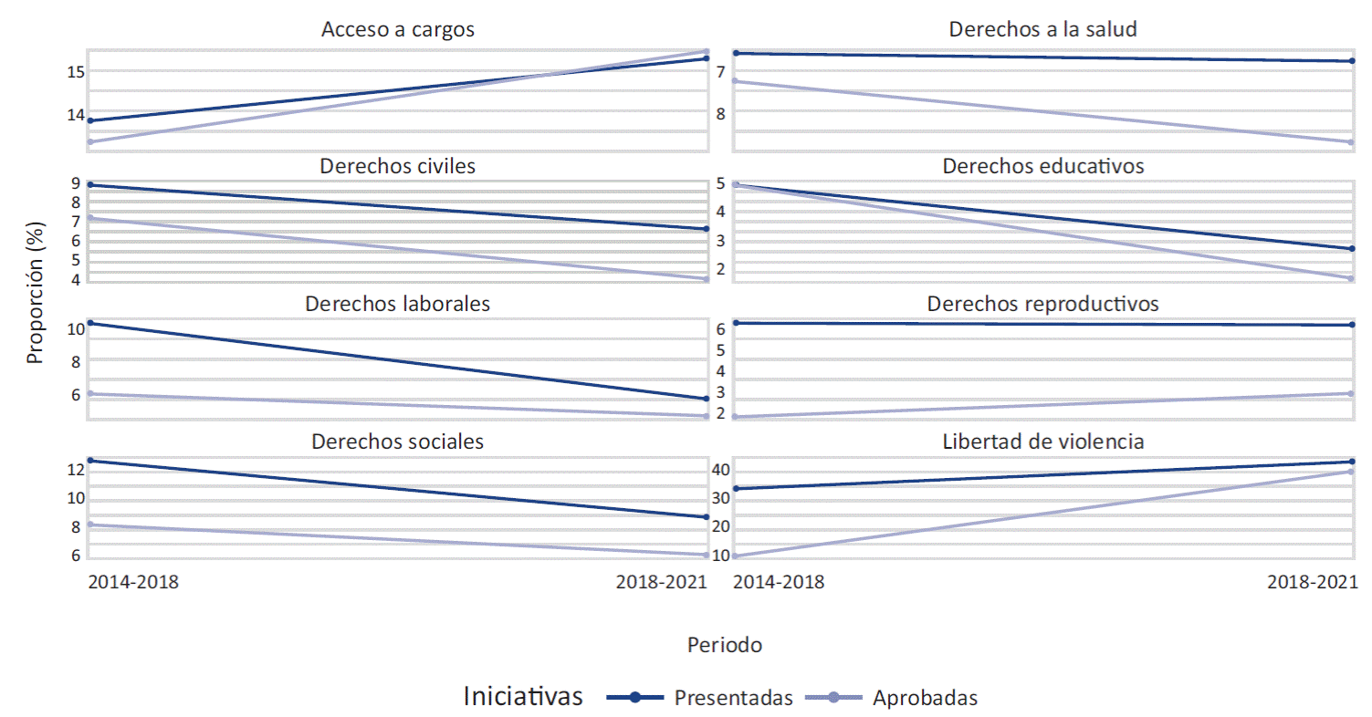 Otras agendas feministas han tenido poca fortuna en la articulación de mayorías legislativas: en el Congreso federal, no se aprobó ninguna iniciativa en relación con los derechos reproductivos de las mujeres y muy pocas en el ámbito de los derechos civiles, educativos, de salud o sociales (Gráfica 7).