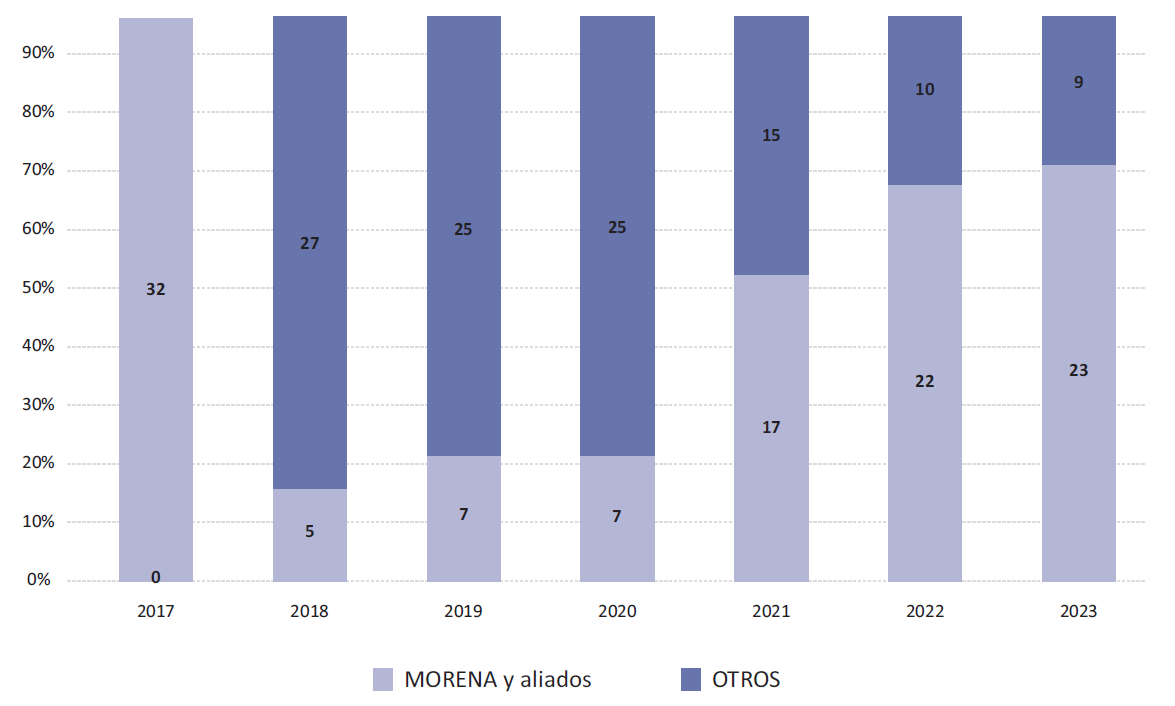 Si el 2018 marcó un giro rotundo en la política nacional, los años que siguieron dejaron en claro que esta reformulación también tenía lugar a nivel subnacional, con MORENA consiguiendo victorias en numerosas contiendas por gubernaturas. Esta transformación resultó más lenta al estar condicionada por un calendario electoral construido con el propósito de tener renovaciones escalonadas de los gobiernos estatales. Sin embargo, los datos dejan en claro la profundidad del cambio: si previo a 2018 las y los candidatos de MORENA no habían logrado ninguna victoria en elecciones estatales, para finales de 2023 la coalición que tiene a dicho partido como actor central controla 21 gubernaturas de 32 (y 2 otros gobernadores pertenecen a partidos que forman parte de la coalición oficialista). Este viraje en quien gobierna los estados mexicanos no solo ha generado transformaciones en la vida política local, sino que ha tenido efectos en la dinámica nacional. Desde el inicio del gobierno de López Obrador los gobernadores identificados con MORENA suelen actuar en bloque, realizando manifestaciones públicas de apoyo al presidente e incluso reformulando la lógica de actuación de la Conferencia Nacional de Gobernadores, que nació con el objetivo de ser un contrapoder a la figura presidencial pero ahora funciona como un grupo de presión para impulsar las iniciativas del jefe del ejecutivo federal.