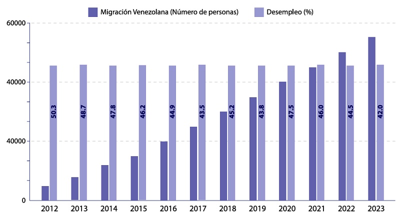 El caso colombiano tiene una particularidad y es la significativa presencia de migrantes venezolanos (entre el 54% y 62% según las dos fuentes), como se expuso al inicio del artículo, dicha migración tiene un peso creciente en la estructura laboral colombiana, especialmente entre los trabajos más precarios debido a la situación legal migratoria que impide, incluso con educación superior, acceder a trabajos de calidad. Esta migración de ciudadanos venezolanos enfrenta barreras culturales y sociales en su proceso de integración (Ortiz, 2021). La crisis en Venezuela ha llevado a una migración masiva, resultando en que muchos de estos migrantes enfrenten la informalidad laboral debido a permisos especiales de permanencia y dificultades para acceder a empleos formales.