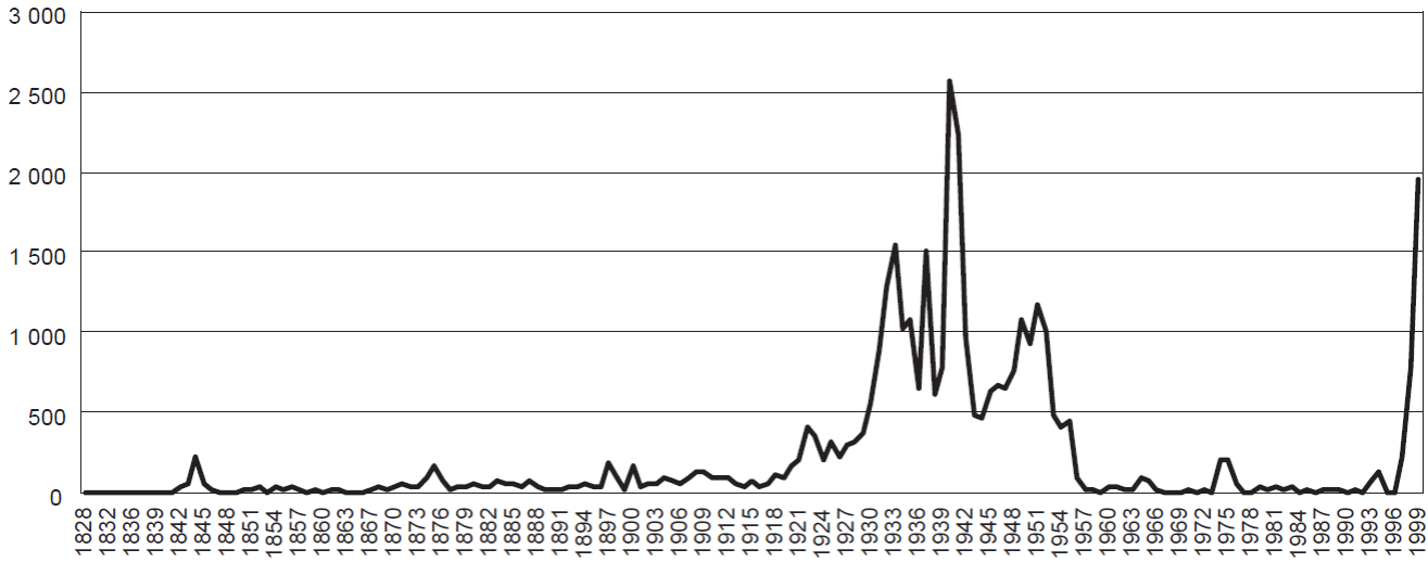 Gráfica 1 Naturalizaciones en México. distribución anual, 1828-1999 (totales)
