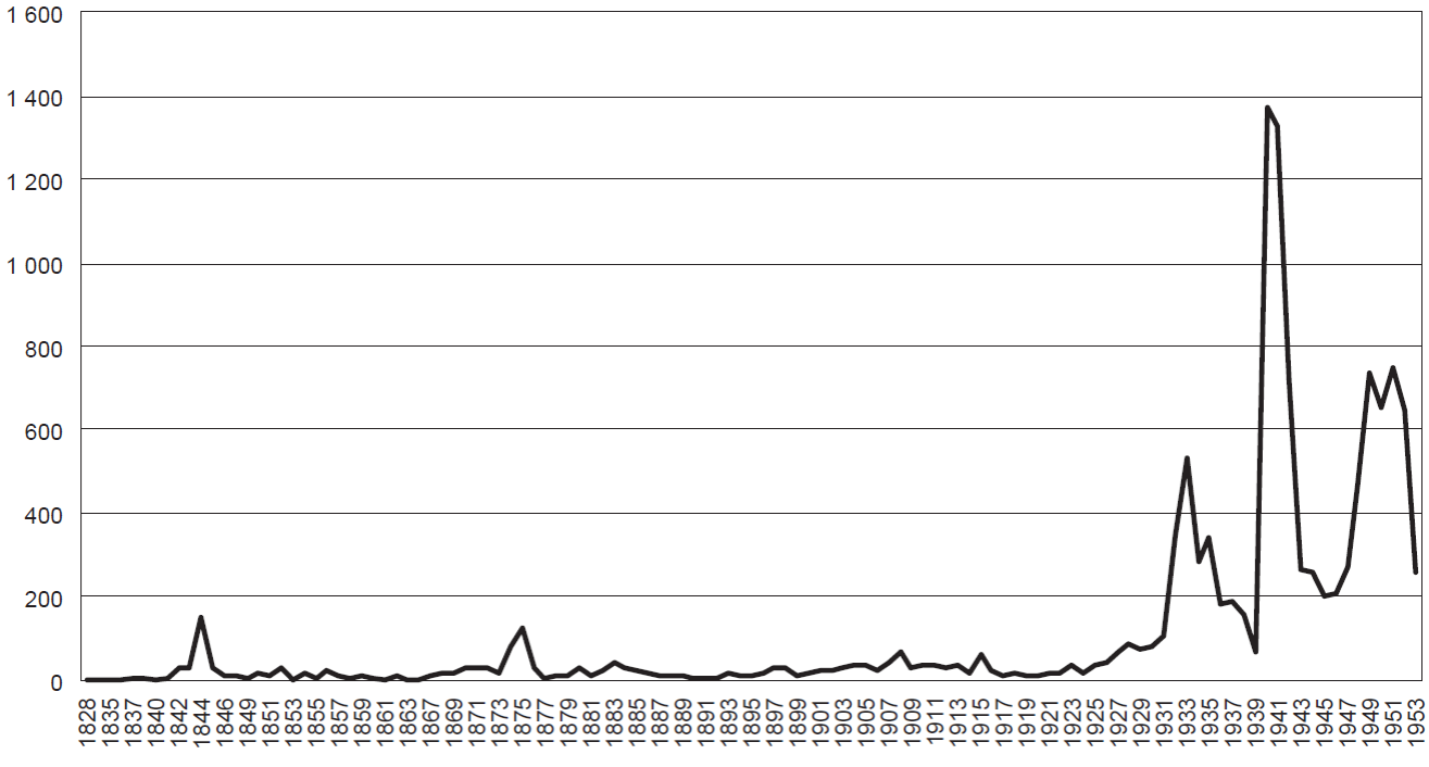 Gráfica 10 Distribución anual de naturalizaciones de españoles, 1828-1949 (totales)
