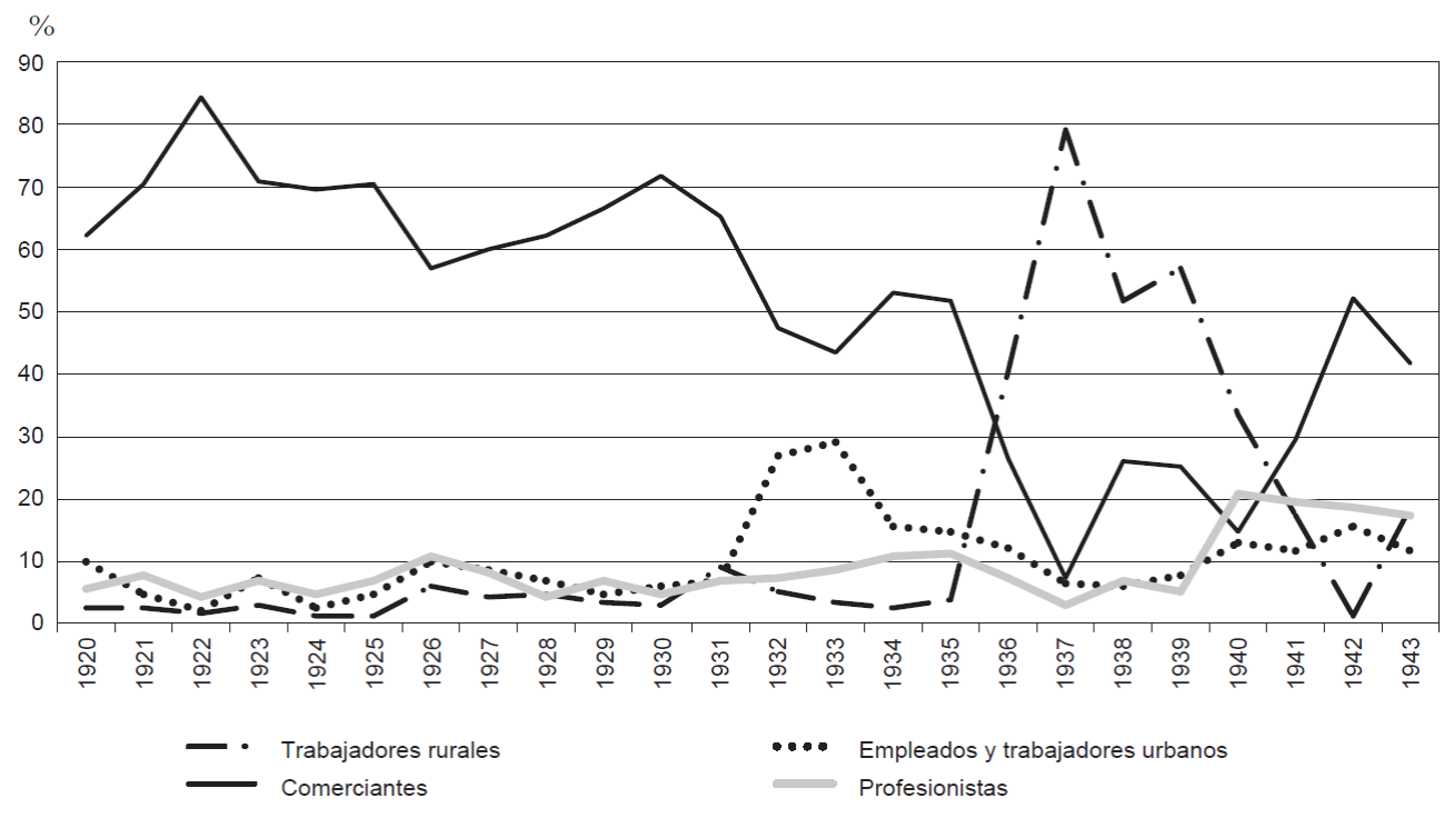 62La serie documental consultada (nota 26) registra más de 500 ocupaciones. Este universo fue tabulado en ocho grupos, a saber: comerciantes, trabajadores urbanos, trabajadores rurales, técnicos y artesanos, empresarios urbanos, empresarios rurales, profesionistas y otros. Por otra parte, esa serie presenta un marcado contraste en la información respecto a las ocupaciones de los naturalizados. Entre 1900 y 1936 no hay información sobre ocupaciones en 2% de los naturalizados; pero este porcentaje crece a 98% para el periodo comprendido entre 1937 y 1953. La única posibilidad de completar estos datos radica en la consulta de los expedientes personales de naturalización. Sin embargo, la Ley de Archivos vigente restringe la consulta de aquellos expedientes con una antigüedad mayor a 70 años. De esta manera el año final que pudimos incluir fue 1943. Como para el conjunto del periodo 1900-1943 se conocía el total de extranjeros naturalizados por año y por la nacionalidad de origen, para el subperiodo 1900-1936, 2% de los naturalizados sin datos se distribuyeron conforme a la proporción observada para 98% de los casos con datos. Resultó más complejo construir la serie para el subperiodo 1937-1943. El trabajo con los expedientes personales contempló un muestreo aleatorio estratificado. Para ello se consideró un tamaño de muestra de 20% del total de naturalizados por cada año con la distribución conocida de la nacionalidad de origen. La serie así construida se integró al conjunto de la serie histórica. Para el caso de los españoles, y en atención a la posibilidad de consultar la serie documental referida a naturalizaciones de refugiados republicanos (nota 27), se pudo separar a los españoles de antigua residencia de los refugiados republicanos. El muestreo se realizó conforme a la distribución anual de las naturalizaciones de españoles desagregados en uno y otro grupo.