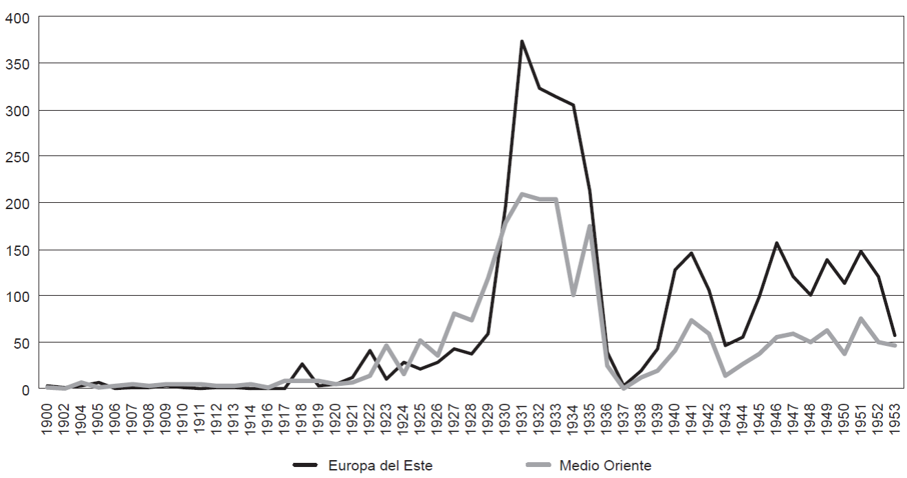 Para la primera mitad del siglo XX, los extranjeros originarios de Europa del Este y Medio Oriente representan casi un tercio del total de naturalizaciones. Si se observa el comportamiento anualizado de esas naturalizaciones se advierte que el final de la primera guerra mundial marca el inicio de un ciclo que con altibajos se prolongó hasta la segunda posguerra. Un moderado ascenso caracteriza los años veinte para a partir de la crisis de 1929 comenzar un ascenso que alcanzará las cotas más elevadas en la primera mitad de los treinta, justamente en medio de la atmósfera más antiextranjera que respiró México durante el siglo pasado. Las naturalizaciones inician una fase de declive entre 1933-1934 en la coyuntura de la discusión y aprobación de la nueva ley de naturalización. En los años de 1936-1937 prácticamente se detiene el otorgamiento de cartas de naturalización para repuntar en los primeros años de la segunda guerra mundial acompañando una ligera apertura en materia migratoria consecuencia en buena medida de las nuevas obligaciones que el país había asumido con el ingreso a la guerra europea. De esta manera los momentos con mayores índices de naturalización fueron, por un lado, los primeros años treinta, atendiendo solicitudes que en su mayoría fueron hechas por inmigrantes que ingresaron al país una década antes; y por otro lado, durante los años de la segunda pos­guerra, cuando parte de los solicitantes corresponden a ­ingresos de finales de los años treinta y principios de los cuarenta.