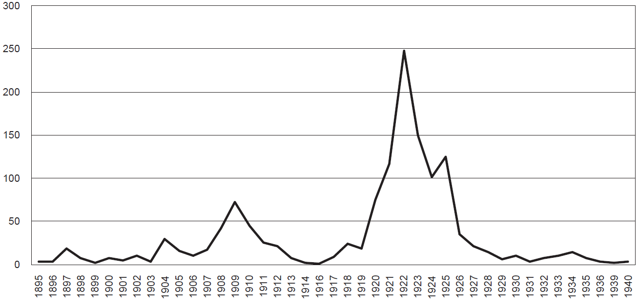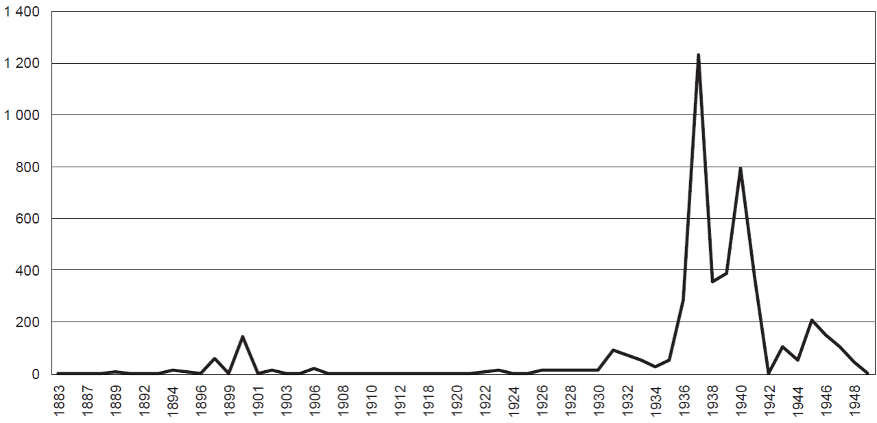 El tema no volvió a ser objeto de análisis hasta la publicación en 2013 de un artículo de Theresa Alfaro Vercamp.21 Con información proveniente de la Secretaría de Relaciones Exteriores y en el marco de una preocupación centrada en las políticas de indeseabilidad hacia la inmigración, la autora realizó una aproximación cuantitativa de lo sucedido entre 1913 y 1931 a la que agregó los años de 1936 y 1937. Por primera vez se ofrece una mirada que articula volúmenes anuales, nacionalidades y lugares de residencia en México dibujando algunas tendencias del comportamiento de las prácticas de naturalización en el periodo de referencia. Sin embargo, las series no fueron consultadas completas, situación que impide entre otras cuestiones valorar la trayectoria de las naturalizaciones durante los años treinta, justamente el periodo en que aumentaron las restricciones migratorias al punto de que México prácticamente cerró sus puertas, con la excepción del masivo arribo de exilados republicanos españoles.