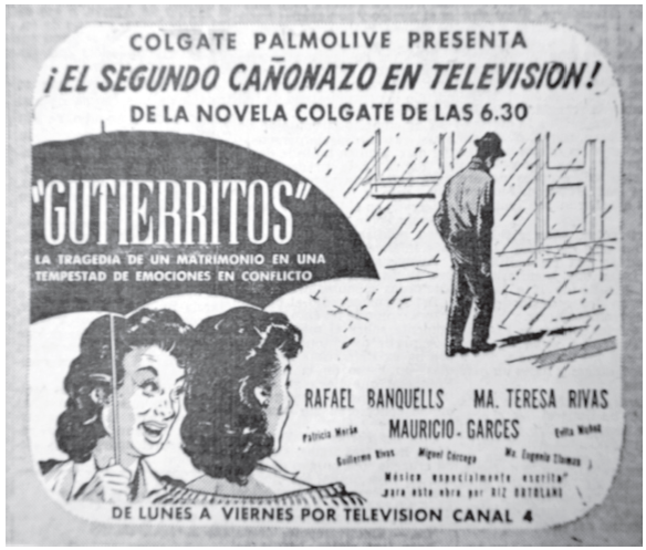 De la encuesta realizada en nuestra investigación a los estudiantes de la Universidad de la Tercera Edad, solo 2 personas de 53 recuerdan haber visto Senda Prohibida. En el caso de las entrevistas, ninguno de los consultados manifestó haberla visto. No obstante, 29 de los encuestados sí recuerdan haber visto la segunda telenovela transmitida en México: Gutierritos,57 la historia de un hombre trabajador y dócil, maltratado por su ambiciosa esposa y traicionado por su mejor amigo (véase la Figura 3). El viernes 15 de agosto de 1958 concluyó Senda Prohibida y el lunes siguiente, 18 de agosto, se emitió el primer capítulo de la nueva novela diaria,58 indicio de que el experimento no iba por mal camino. La fórmula se repitió: Rafael Banquells en la dirección, Colgate-Palmolive como patrocinador, el horario de las 6:30 p. m., de lunes a viernes, por el canal 4. Colgate presentó la publicidad con el eslogan: “¡El segundo cañonazo en televisión!”.59 La historia también era producto de la adaptación de una radionovela escrita por Estela Calderón. En esta oportunidad, el director asumió el papel protagónico, con el personaje de Ángel Gutiérrez, en compañía de María Teresa Rivas, en el papel de Rosa, la esposa dominante, y Mauricio Garcés como Jorge, el mejor amigo del protagonista.