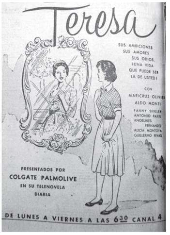 Después del capítulo final de El precio del cielo, el martes 13 de octubre de 1959, Colgate presentó el primer capítulo de la telenovela Teresa.69 Original de Mimí Bechelani, contaba la historia de una joven universitaria, inteligente, que repudiaba su condición humilde y la de su familia. Preocupada por ascender socialmente, la joven decide seducir y engañar a hombres adinerados, rechazando el amor de un estudiante de medicina que vivía en su vecindad. Dirigida por Rafael Banquells, la octava producción de Colgate acudió a la tecnología del video-tape, que ya no exigía una realización en vivo y en directo y abrió el camino hacia la comercialización y retransmisión de las producciones televisivas (véase la Figura 5).70 La sucesión de melodramas hasta mediados de la década de 1960 es por demás amplia y diversa.71 La exploración de nuevos horarios, canales de transmisión, temáticas y personalidades del cine y la radio consolidó un género con espacio propio.
