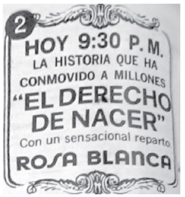 “Se convertirá en un programa apasionante”, continuó Novedades.45 Parte de esa percepción se asociaba con el antecedente de la radionovela, pues Senda Prohibida fue escrita por Fernanda Villeli, autora mexicana de series radiofónicas a quien le encargaron adaptar una historia suya de radio para televisión. En capítulos de media hora, el producto fue un experimento que empezó a demandar recursos tecnológicos, especialización y profesionalización exclusivos. La pantalla chica solía ser considerada por la crítica, y en especial por el cine mexicano, actores,46 directores y productores, como una industria de baja calidad, carente de valor artístico y con poco estímulo y competencia.47 Escribir exclusivamente para televisión, como lo hizo Villeli, fue parte clave del desarrollo profesional de guiones, lenguajes, escenografías y estéticas del medio. La telenovela, al emitir diariamente un episodio distinto, en vivo y sin apuntador, exigió profesionales de la actuación, dirección y producción de amplia trayectoria.48 No era suficiente con reproducir las fórmulas de la radio, el teatro y el cine en la pantalla chica. Por ende, la telenovela fue uno de los primeros productos en delinear un carácter propio y auténticamente televisivo.
