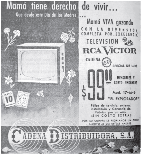 Las facilidades de pago eran comunes en las tiendas Sears y Liverpool, con créditos, preventas navideñas, descuentos y obsequios adicionales (radio o mesa) por la compra del televisor; incluso, se recibían radios y tocadiscos usados como enganche para el nuevo electrodoméstico. Para el día de la madre y el de navidad, la publicidad de televisores se intensificaba en la prensa. Para la conmemoración de dichas fechas, los anuncios acostumbraban asociar al televisor con el público femenino, con la unión familiar o con los deportes masculinos. Los promocionales impresos solían mostrar la imagen de una pantalla encendida donde dibujaban una mujer o la práctica de actividades deportivas -futbol, box, toreo-. Los días previos al 10 de mayo, por ejemplo, las campañas presentaban el televisor como el mejor regalo para las madres. “Un elegante presente para mamá”, indicaba el almacén La estufa Universal S. A. El tema se vinculaba con una suerte de homenaje, un premio, la felicidad: “Usted también puede hacer muy feliz a su madrecita el 10 de mayo con el incomparable regalo de un aparato Skymaster”, un modelo integrado de radio, T. V. y tocadiscos de alta fidelidad. “Algo digno de ella […] adquiéralos en nuestros distribuidores autorizados”, decía la marca Zenith en Excelsior. Sin embargo, el esquema no era nuevo. El cine y la prensa, en especial, ya habían sido promotores del despliegue publicitario en virtud de “la madre” y la celebración del 10 de mayo.103 Con la televisión se aprovecha la novedad por el cambio tecnológico, se crea el imperativo de actualizarse, de no quedarse atrás ante los avances de la tecnología y, por supuesto, se alude a una nueva fuente de entretenimiento e información que las madres, en este caso, merecen tener a su alcance. El televisor se convertía en el obsequio ideal para la madre y al mismo tiempo en un nuevo recurso publicitario para promover su día y el despliegue comercial que éste representaba. La televisión era la nueva gran vitrina de exhibición de productos de consumo para toda la familia, además de la nueva plataforma de reafirmación de modelos y valores familiares, muchos de ellos tradicionales.