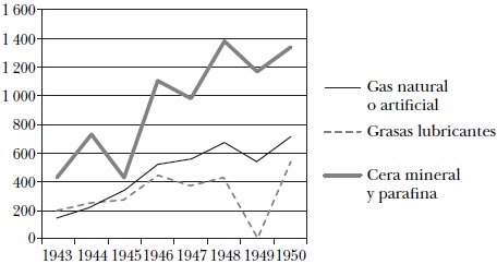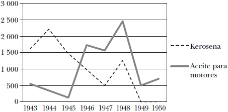 Aunque la propuesta de noviembre de 1942 no se concretó, sabemos que la compañía Phillips había sido proveedora de Petróleos Mexicanos por lo menos durante 1941 y 1942, así que la demanda de lubricantes estadounidenses por parte de la empresa mexicana venía de tiempo atrás. Más aún, para 1946 dicha demanda se mantenía, pues Petróleos Mexicanos continuaba adquiriendo el producto de una pequeña empresa en Oklahoma.67 La utilidad que tenían los lubricantes para mantener funcionando maquinaria usada podría sugerir que la demanda mexicana de este tipo de productos debió haber sido mayor durante la segunda guerra mundial que en la posguerra; empero, la trayectoria comercial de las grasas lubricantes no corrobora esta suposición, presuntamente por la imposibilidad estadounidense de satisfacer dicha demanda en medio del conflicto (véase nuevamente la gráfica 4).