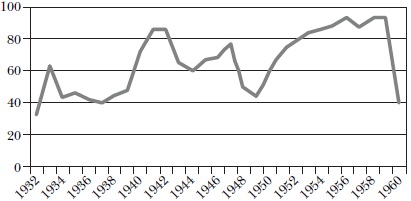 Ahora bien, la caída en el índice de concentración entre 1947 y 1949 sugiere que la posguerra favoreció la diversificación geográfica de las exportaciones mexicanas de petróleo. A ello sin duda contribuyeron las ya mencionadas devaluaciones del peso mexicano de finales de los años cuarenta, que abarataron el precio de dichos bienes. Después de 1949 y durante casi toda la década de 1950 el nuevo incremento en el índice de concentración podría haber obedecido al incremento en las necesidades energéticas de Estados Unidos y su mayor dependencia de las importaciones petroleras.