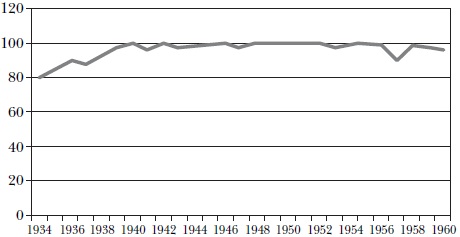 Gráfica 5 Índice de concentración de las importaciones mexicanas de petróleo y sus derivados, 1934-1960