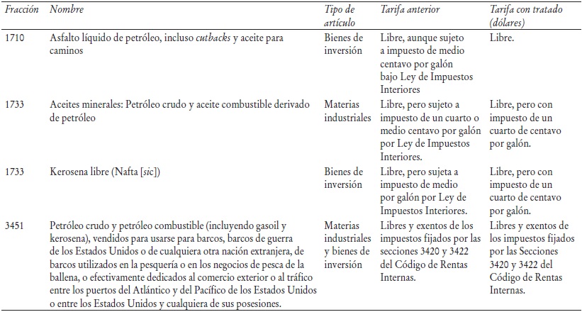 Aunque sus aranceles sólo fueron consolidados, se eliminó la cuota para los productos petroleros y se les otorgaron concesiones fiscales por lo que toca a los gravámenes internos que pagaban al entrar a Estados Unidos. En tanto que el asfalto y la kerosena quedaron exentos de impuestos, el pago de gravamen interior para el petróleo crudo y el petróleo combustible se redujo a la mitad (véase el cuadro 2). De esta manera, con el acuerdo se consolidó el tratamiento arancelario que ya recibían las exportaciones mexicanas destinadas al abastecimiento de barcos, refinación y ulterior exportación, y el impuesto para gravar todas las exportaciones petroleras mexicanas se fijó en un nivel más bajo (un cuarto de centavo de dólar por galón, en lugar de medio).