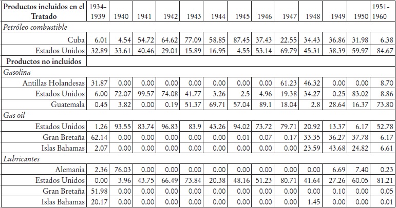 Cuadro 5 Participación relativa de los principales países de origen de las importaciones mexicanas de petróleo, por producto (1934-1960) (%)