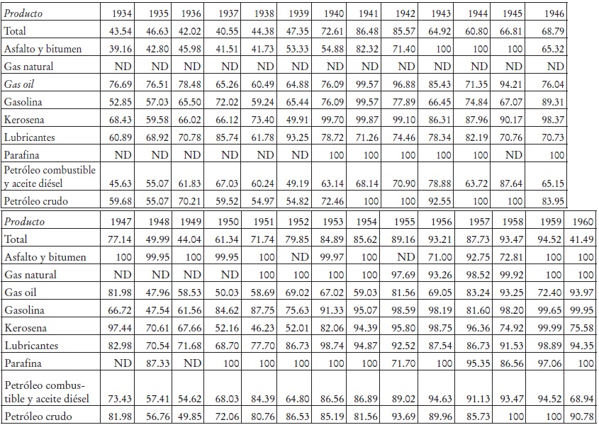 Un análisis del índice de concentración por artículo petrolero de exportación arroja un panorama un poco distinto (véanse Anexo y cuadro 3). En el caso de los bienes que sí se contemplaron en el Tratado, el índice de concentración del petróleo crudo muestra que la guerra favoreció la concentración de sus ventas en Estados Unidos a un nivel superior al promedio de los años treinta y, en el primer lustro de la década de 1940, por encima del promedio de la década de los cincuenta. La concentración de la kerosena presentó una evolución similar, se mantuvo con algunos vaivenes entre 1939 y 1947 y luego descendió. En el asfalto, cuyos valores de exportación fueron muy bajos, el índice de concentración se elevó desde 1938, cayó entre 1943 y 1945, y después se recuperó. El índice de concentración de petróleo combustible se elevó en los primeros cinco años de la década de los cuarenta y luego decreció, aunque menos que en los años treinta; en este caso las principales ventas de la década de 1940 se destinaron a Cuba.