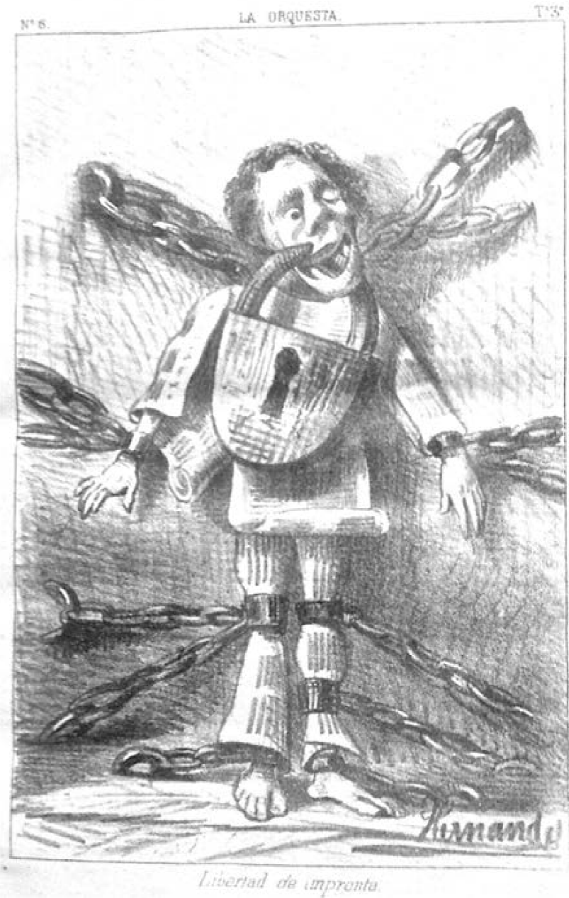 Un pequeño, delgado y frágil hombre, que va descalzo y cuyos ropajes no son otra cosa que planas de papel periódico, caracteriza a la libertad de imprenta. A su débil aspecto se suma la circunstancia de encontrarse preso, inmovilizado con apretados grilletes y varias cadenas, todas de gran tamaño. Un terrible y colosal criminal debía de ser para requerir tres grilletes en la pierna izquierda, dos en la derecha y uno en cada muñeca, además de sujetar una cadena su cuello hasta casi asfixiarlo. Por si todas esas medidas de seguridad fueran pocas, para acallarlo un inmenso candado atraviesa su mandíbula, descolgándola. Tiene el rostro desfigurado, por el peso mismo del candado, pero también acusando el maltrato recibido. Así se representaba a la “Libertad de imprenta” en una imagen publicada en las páginas deLa Orquesta el 19 de enero de 1870 (caricatura 1). El mensaje de la caricatura es evidente: los miembros de la prensa, al menos de una parte de ella, se sentían profundamente amenazados y totalmente indefensos ante las disposiciones legales; o al menos así pretendían mostrarse frente a las medidas gubernamentales.