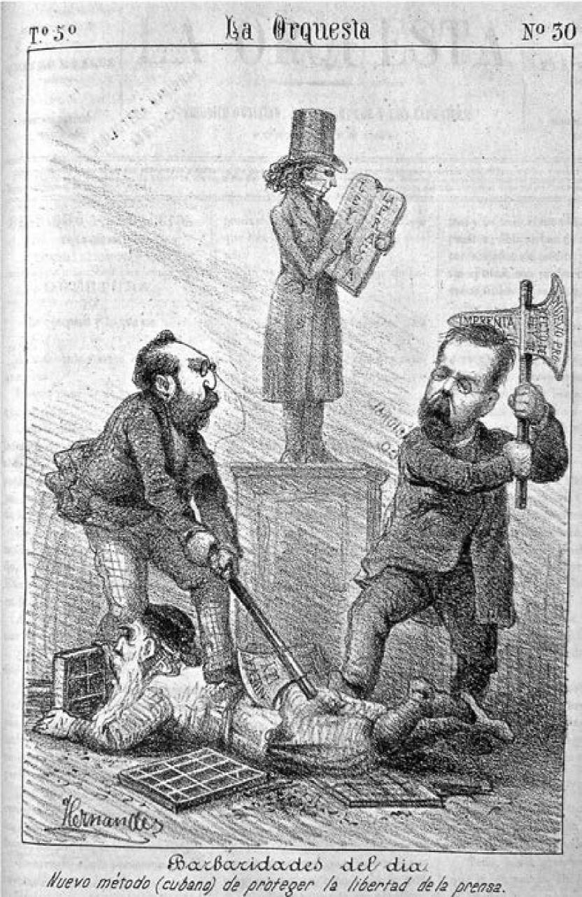 La caricatura enuncia la conflictiva situación mostrando la propuesta como una “amenaza” y patentiza los temores que genera; pero, sobre todo, sintetiza las complejidades del escenario político en relación con el tema que nos ocupa. Aunque no hay sangre, ni desmembramientos evidentes en la escena, toda ella sugiere una gran violencia: la ley que proponían destruiría brutalmente a la prensa. La imagen se complementa con el título y el subtítulo que la acompaña y que reafirma el toque irónico: “Barbaridades del día. Nuevo método (cubano) de proteger la libertad de la prensa”. Lo bárbaro es, al mismo tiempo, algo necio, pero también temerario, algo que es excesivo y causa asombro, pero también puede provocar extrañeza. El término cubano, por su parte, aludía al origen de Santacilia, nacido en la isla. Todo ello, sugiere la caricatura, se mezclaba en las acciones emprendidas por Prieto y Santacilia para regular a la prensa. La ley es presentada y representada en la imagen satírica como el arma brutal con la que las autoridades lograrán imponerse al mundo de la imprenta, socavarla y destruirla.