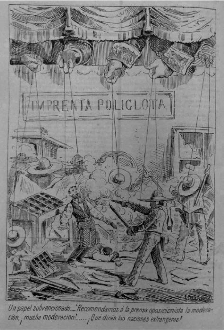 El asalto a la imprenta La Políglota, que dejó heridos y un muerto como saldo, fue el más llamativo, violento y extraordinario suceso contra la prensa y sus integrantes, pero no fue el único. Para un sector de la prensa la suma de ataques no era más que la puesta en práctica de una política que perseguía poner freno a la libertad de imprenta y de expresión. Esa política, consideramos, escondía el temor de las autoridades de ser expuestas en sus errores, debilidades y vicios o, simplemente, era el recurso último mostrado ante la falta de capacidad para enfrentar y responder a la crítica con los mismos medios. Y en efecto, lo era. Desde el arribo de los tuxtepecanos al poder la política de control sobre la prensa se endureció; primero por medio de la presión legal y después, cuando sintieron que la primera no rendía los frutos que esperaban, se valieron de la represión extralegal.53