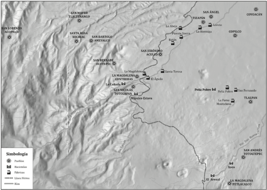 Mapa 2 Pueblos, haciendas, fábricas y ríos en algunas serranías del suroeste de la Ciudad de México