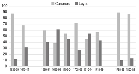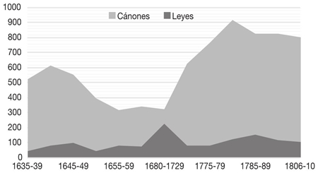 Si entre 1691 y 1700, y en oposición a la tendencia histórica, los cursos ganados en Leyes superan a los ganados en Cánones -437 frente a 377-,47 a partir de principios de siglo Cánones se recupera y vuelve a superar a Leyes, tanto en matrículas como en grados, aunque con una diferencia mucho menor que la acostumbrada. Esta diferencia se mantiene más o menos estable, reduciéndose en los primeros años de la década de 1720, tal vez con motivo de la señalada revitalización de la Audiencia. Sin embargo, y asumiendo que esta revitalización fuera la causa de este aumento legista puntual, el nombramiento de nuevos cargos había recaído a favor de juristas exclusivamente peninsulares, sin lazos personales con la sociedad novohispana, algo que continuaba férreamente perseguido por la casa de los Borbones, y que se mantendrá durante todo lo que quedaba de virreinato.48