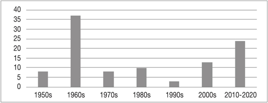 En cada una de las décadas subsiguientes, los artículos sobre el periodo 1855-1867 no rebasaron la decena. En 1972 se publican, “en el centenario de la muerte de Benito Juárez”, seis artículos sobre la era del Benemérito, entre los cuales sólo uno se centra en la figura del presidente oaxaqueño. La discusión de Juárez como “sustancia y esencia incuestionable del principio de autoridad” es, sorprendentemente, la única contribución del prolífico historiador José C. Valadés a la revista.8 En la primera década del siglo XXI parece haber un repunte en el interés por los temas de la Reforma que resulta, sin embargo, engañoso.9 A lo largo de los 11 años siguientes, hay un aumento sustancial en los textos sobre el periodo. De los 18 artículos que tocan el periodo, 9 forman parte de dossiers: el que se publica para marcar el 150 aniversario del Segundo Imperio y otro abocado a la desamortización civil, proceso que rebasa ampliamente a la “gran década nacional”, pero para el que la Reforma es una referencia inevitable. Así, más allá de un interés disparejo por marcar ciertos aniversarios, parece haber sido el interés de los investigadores lo que marcó el ritmo de publicación de textos sobre la Reforma.