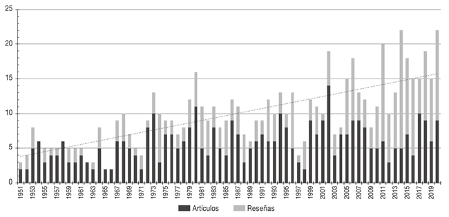 Fuente: Historia Mexicana, números 1-278, 1951-2020. https://historiamexicana.colmex.mx/index.php/RHM Nota: cuando se encontraron varias reseñas sobre una misma publicación se incluyó sólo una.
