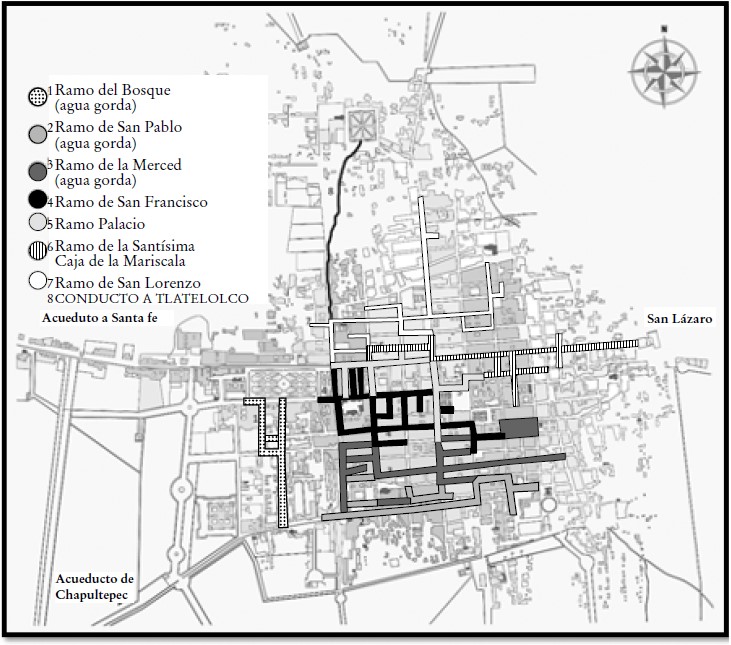 A lo largo de su historia, la ciudad de México ha demandado una cantidad muy grande de agua, que ha provenido de lugares cercanos (o a veces no tanto). A finales del siglo XVIII y principios del XIX la ciudad dependía del agua limpia que entraba por los acueductos de Chapultepec y Santa Fe, la cual se distribuía entre la población por medio de conductos subterráneos llamados ramos de agua.1 Estos conductos contaban con fuentes públicas y privadas que llevaban hacia la superficie el agua que utilizaba la población de la capital.