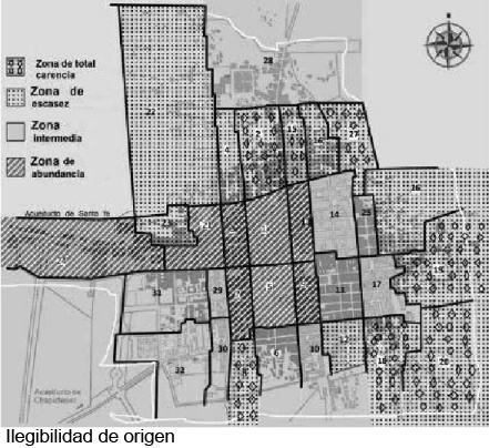 Para identificar las zonas de abundancia, consideramos aquellos cuarteles menores que tenían menos de 350 personas por cada toma de agua. Determinar este factor fue una decisión muy difícil ya que no hay estudios que utilicen algo semejante a lo que aquí se propone. Sin embargo, nuestro criterio se formó considerando que el promedio de personas por fuente (tomando sólo en cuenta aquellos cuarteles que tenían al menos una de ellas) es de 383. Quisimos identificar como la zona de abundancia aquellos cuarteles que tuvieran menos de 10% del promedio ya mencionado.