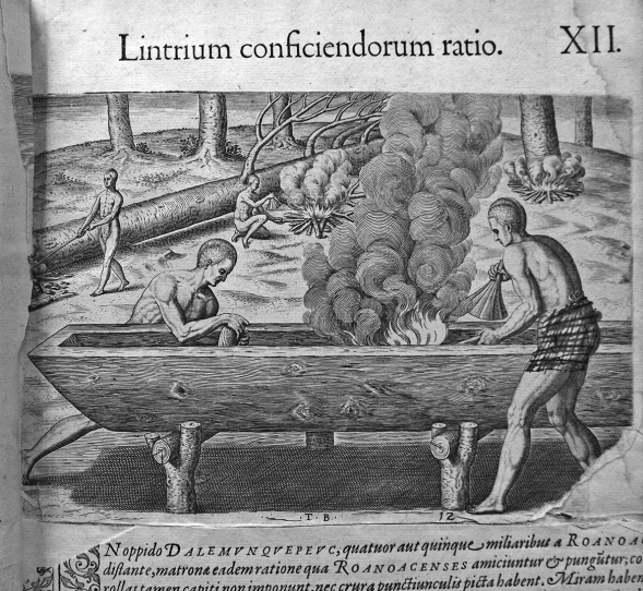 Grabado censurado “Lintrium conficiendorum ratio”, en Theodor de Bry, Historia Americae, sive, Novi orbis continens in XIII distinctis partibus verissimam… Francoforti ad Moenum, typis Joannis Wecheli; sumptibus vero Theodori de Bry, venales reperiuntur officina Sigismundi Feirabendi, 1590. Tomo primero, grabado XII. Biblioteca Eusebio Francisco Kino de la Compañía de Jesús en México 17712.