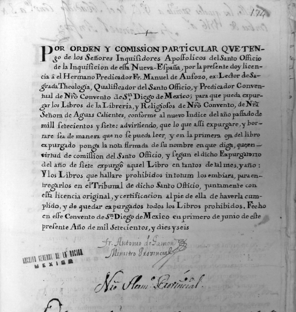 Por orden, y comission particular que tengo de los Señores Inquisidores Apostolicos del Santo Officio de la Inquisicion de esta Nueva-España, por la presente doy licencia à Fray Miguel de Herrera, Procurador, ex Custodio y Guardian de nuestro Convento de Oaxaca para que pueda expurgar los libros de dicho nuestro convento de Nuestro Padre San Francisco de la Ciudad de Oaxaca, conforme al nuevo Indice del año passado de mill setecientos y siete.61