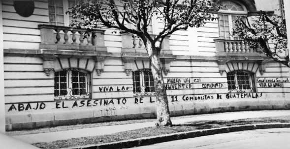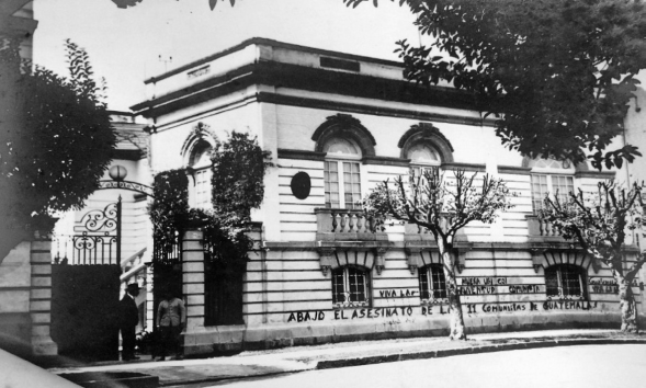 Ciertamente, el hostigamiento a sus legaciones en Europa y las cartas de protesta que los miembros de la Liga Antimperialista enviaron desde Estados Unidos sólo fueron un trago amargo para los funcionarios. Acaso la confirmación de los vínculos de los comunistas y la amenaza que habían conjurado. Empero, las protestas también irrumpieron en su vecindad. El 12 de febrero de 1932, el embajador reportó un atentado a la casa de la legación en México. Sus paredes amanecieron manchadas con leyendas altisonantes: ¡Viva la juventud comunista! ¡Abajo el asesinato de los once comunistas en Guatemala! ¡Muera Ubico! ¡Viva la URSS! (véanse las fotos 3 y 4).72 Además, hallaron cascos de botella, piedras y algunos panfletos. Días más tarde, el 16 de febrero por la noche, una manifestación tuvo lugar frente a la legación. El embajador denunció estas acciones ante las autoridades y envió a Guatemala una de las hojas volantes que lanzaron los protestantes. Tildaban a Ubico de fascista y asesino, aduciendo que apoyaban la lucha de la juventud obrera en Guatemala. La firma despejó las dudas sobre la autoría del atentado: el Comité Central de la Federación Juvenil Comunista de México.73