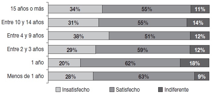 El nivel de satisfacción con los estadios para el Mundial de 2014 es mayor entre los seguidores organizados con un periodo más corto de pertenencia a las torcidas. Los que tienen menos de un año o un año completo alcanzaron, respectivamente de 63% y 62% de satisfacción, que representan los mayores niveles de aprobación. Los aficionados con entre dos y tres años de pertenencia reportaron 59% de satisfacción. En los porcentajes menores, 51% de los entrevistados con cuatro a nueve años de pertenencia dijo estar satisfecho con los nuevos estadios. Un total de 55% de los aficionados con un periodo de pertenencia igual o mayor de 10 años declaró estar satisfecho con las sedes deportivas inauguradas para la Copa Mundial de 2014, de acuerdo con la siguiente gráfica.
