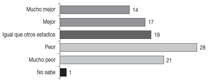 Si antes los aficionados con el mayor nivel educativo eran los más satisfechos con las nuevas construcciones para el Mundial de 2014, en la segunda pregunta fueron los más insatisfechos. Es decir, cuanto mayor el nivel educativo, más críticos e insatisfechos tienden a mostrarse los seguidores organizados respecto de las arenas. De acuerdo con la siguiente gráfica, 54% de los encuestados que cuentan con un grado universitario considera que la arena es peor. Este porcentaje disminuye a 49% entre quienes tienen la preparatoria. Por último, el porcentaje baja un poco más, a 46%, entre quienes tienen una educación primaria.19