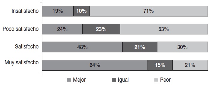 Así, 23% de los encuestados declaró estar satisfecho con los estadios para el Mundial de 2014 y creyó que la arena es mejor para los seguidores organizados. Un porcentaje igual de los encuestados, 23%, mostró estar insatisfecho con los estadios para el Mundial de 2014 y percibió un deterioro causado por las nuevas sedes para las TO. De hecho, estos dos subgrupos llevan en nuestro estudio el nombre de “mejor-satisfecho” y “peor-insatisfecho”, respectivamente. Éstos son los dos porcentajes principales y cumplen con la expectativa de la hipótesis general. Sin embargo, entre mejor evaluada está una variable, mejor tendería a estarlo la otra, de lo cual se esperaría, por silogismo, el efecto opuesto en términos proporcionales.