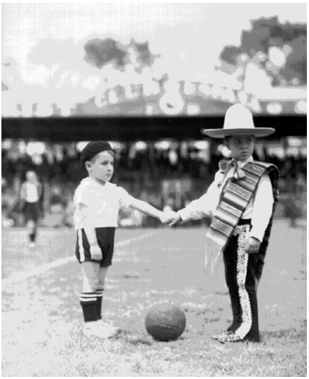 Los equipos españoles no eran los únicos que portaban símbolos de identidad nacional ni tampoco los únicos instigadores de que los partidos se convirtieran en justas entre españoles y mexicanos. Equipos como América y Atlante también asumían emblemas nacionales. En varios retratos de futbolistas de estos equipos en momentos previos al inicio de los partidos aparecen acompañados de niños vestidos de charros y chinas (imagen 1). No hay que perder de vista que las décadas de 1920 y 1930 -cuando se gestó la rivalidad entre los equipos españoles y mexicanos y tuvo sus momentos más álgidos- fueron el momento de auge del nacionalismo cultural.38 En 1931 -el mismo año del partido Atlante-Racing- el gobierno mexicano lanzó la Campaña Nacionalista, mientras proliferaban los movimientos xenófobos en el país.39 No es extraño que en este entorno cobrara una importancia central la identificación de ciertos equipos como mexicanos enfrentados a clubes que representaban lo extranjero.