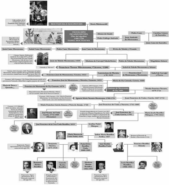 La elaboración particular de un árbol genealógico sobre esta familia Moctezuma en Venezuela, ha sido el recurso principal para complementar el entramado de ”saberes huecos y fracturados”18 atravesado emotivamente, como se ha señalado, por las crónicas, el mito, la oralidad y la memoria familiar19 (véase el árbol genealógico anexo). Y también ha servido para identificar algunas actuaciones personales y estrategias de adaptación y sobrevivencia en el contexto socio-temporal en el cual se desempeñaron.