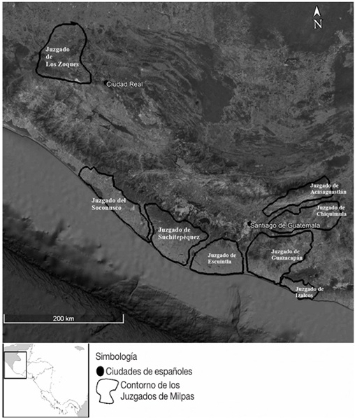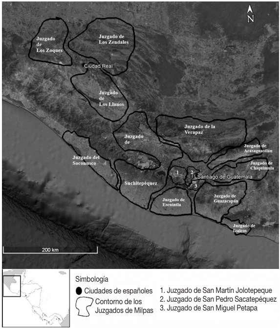Enfocando nuestra atención en las provincias de Chiapas8 y de Guatemala,9 en este artículo perseguimos un doble objetivo. Por un lado, pretendemos precisar algunos aspectos todavía oscuros sobre la historia de los Juzgados de Milpas, en particular los relativos a su creación a mediados del siglo XVI, a su existencia intermitente a lo largo de 80 años (1570-1650) y a su definitiva desaparición en la década de 1670. Y, por otro lado, buscamos mostrar cómo las transformaciones demográficas, económicas y sociales que vivieron ambas provincias fueron cambiando la función de dichos juzgados.
