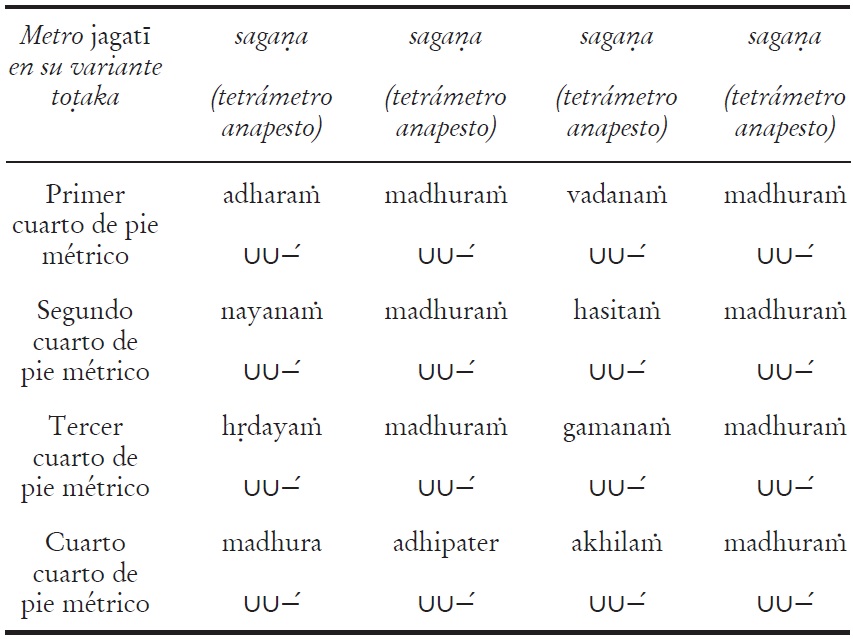 Obsérvese cómo cada uno de los signos corresponde a una vocal y cómo las cantidades vocálicas se mezclan en cada palabra para formar un tetrámetro; este tetrámetro tiene una estructura ∪∪−́ (breve, breve, larga), donde el acento cae en la vocal larga y le da cadencia y suavidad al verso. En la métrica sánscrita hay grupos de tetrámetros que se identifican de acuerdo con su estructura, es decir, con la combinación de vocales. Por ejemplo, en el texto Madhurāṣṭakam la estructura ∪∪− (breve, breve, larga) se conoce como sagaṇa o simplemente sa. En la tradición grecorromana se le conoce como “tetrámetro anapesto”. Obsérvese la siguiente estructura que forma el cuarto de pie métrico: