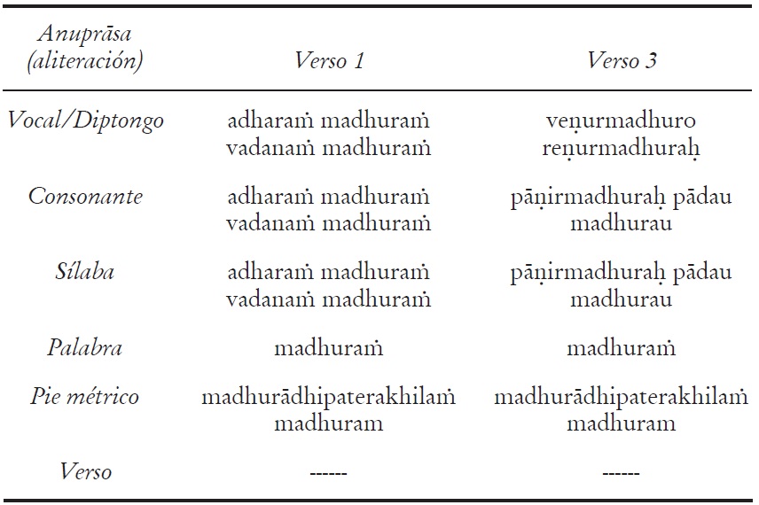 Otra de las características recurrentes de los versos que componen el Madhurāṣṭakam se relaciona con la utilización de las figuras retóricas, en sánscrito alaṁkāra. Una de las figuras retóricas en los versos es el anuprāsa, en español conocida como “aliteración”. El anuprāsa consiste en la repetición o recurrencia de una consonante, una vocal o una sílaba para producir un sonido armonioso. El anuprāsa es una figura que produce sonidos armoniosos y juega con la repetición. Se pueden repetir desde sonidos vocálicos, consonánticos y silábicos, hasta una palabra, un pie métrico o un verso completo. El siguiente esquema dejará más claro lo descrito:
