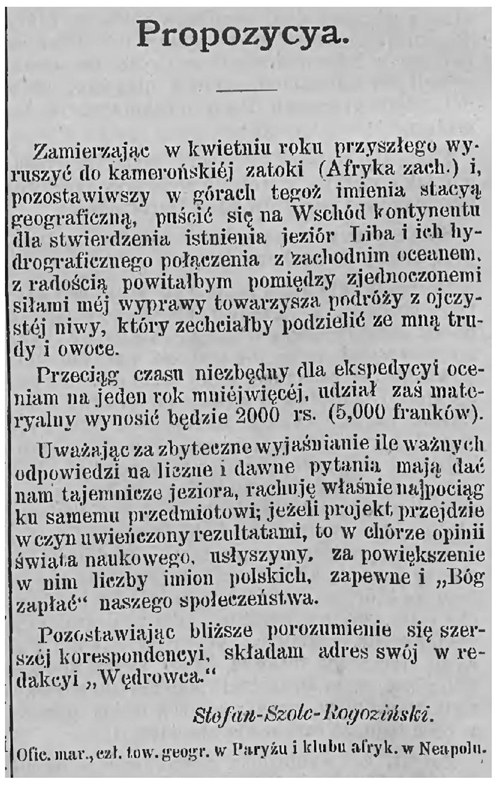 En septiembre de 1881, un joven meteorólogo polaco, Leopold Janikowski, respondía a un anuncio publicado en la revista Wędrowiec por un desconocido Stefan Szolc-Rogoziński, “oficial de la armada, miembro de la sociedad geográfica de París y del club africano de Nápoles” (imagen 1),1 que buscaba compañeros de viaje para una expedición de un año cuyo objetivo era la creación de una estación geográfica en la bahía de Ambas, la exploración de las tierras altas de Camerún y la penetración del área en busca del lago Liba. Según Szolc-Rogoziński (1881), “si el proyecto genera resultados, veremos aumentar el número de voces polacas en el coro de opiniones del mundo científico y ‘Dios bendecirá’ nuestra sociedad”.2