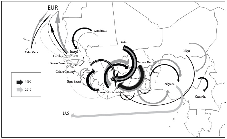 Éstos y otros cambios ocurridos desde 1990 en las migraciones mundiales en general, y en las africanas en particular, se abordarán en los dos siguientes apartados. Posteriormente, el estudio se centrará en las migraciones internacionales experimentadas en los diferentes países de África occidental. En primer lugar, se analizarán los flujos migratorios de esta región desde el periodo colonial hasta inicios de la década de 1990, tanto con datos cuantitativos y cualitativos recogidos en diferentes publicaciones como con información estadística de dos investigaciones. La primera, elaborada por Zachariah y Condé (1981), autores que crearon una matriz de migraciones entre nueve países de África occidental utilizando los censos de población de 1975 de dichos territorios. La segunda investigación es la encuesta REMUAO,1 que cuantificó mediante entrevistas en hogares los flujos migratorios internos e internacionales que se produjeron en ocho países de África occidental durante 1988-1992. Finalmente, para el periodo 1990-2010 se recurre a la estadística Trends in International Migrant Stock de las Naciones Unidas (UN-DESA 2015), ya que dicha fuente recopila información sobre las salidas (países de origen) y las llegadas (países de destino) de los migrantes2 por países, por regiones3 y por continentes para los años 1990 y 2010.4