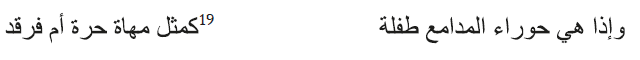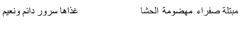 Oh, Príncipe de los Creyentes, cásate con quien tenga pies finos, talones sanos,3 piernas suaves, rodillas grandes, muslos redondos, brazos grandes, manos delicadas, pechos redondeados y turgentes, mejillas rojas, ojos enmarcados como si estuvieran perfilados con kohl, cejas finas y arqueadas, labios rojo grana, de entrecejo amplio, nariz fina, dientes blancos, cabello negro, cuello largo y abdomen plano (Al-Ibšīhī 2008, 671).