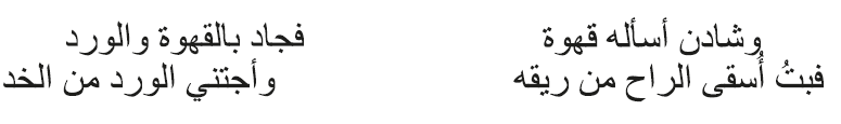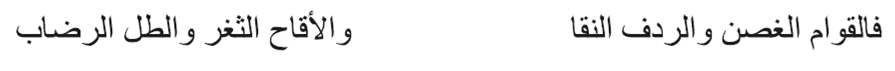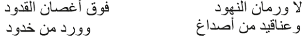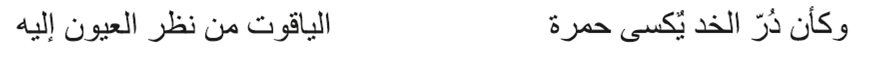 En diversas descripciones poéticas, como en el verso anterior, las mejillas suelen estar relacionadas con el color rosa o rojo y se comparan con las flores (Safi 2012, 73). Esta metáfora es tan corriente y ha sido tan usada que se mantiene incluso hasta el siglo XX, como ilustra este verso de H̱ayrī Al-Hindāwī (siglo XX):