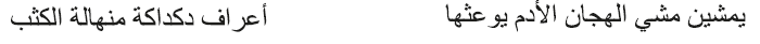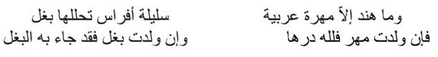 La representación en las manifestaciones literarias del camello, la gacela y la paloma como figuras alegóricas de la mujer y sus cualidades es frecuente, pero los poetas también recurrían a otros animales, como la yegua, e incluso a otros más pintorescos, como los gusanos o los escorpiones. Algunas de estas alegorías se refieren más a las facultades del animal que a sus atributos físicos. Hind bt. Al-Nu‘mān b. Bašīr (siglo VII) le dedicó estos dos versos a su marido, Al-Ḥağğāğ b. Yūsuf,23 a modo de sátira, refiriéndose a sí misma como una yegua y comparándolo a él con un mulo: