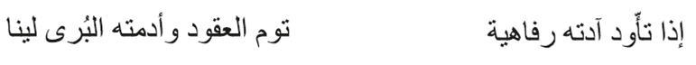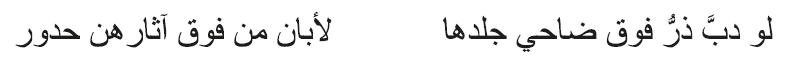 También tiende a destacarse la delicadeza de la piel, que al mínimo roce puede lastimarse de lo fina que es (Tağūr 1999, 311). Aquí muestra ‘Umar b. Abī Rabī‘a hasta qué punto llega la exquisitez de su amada: